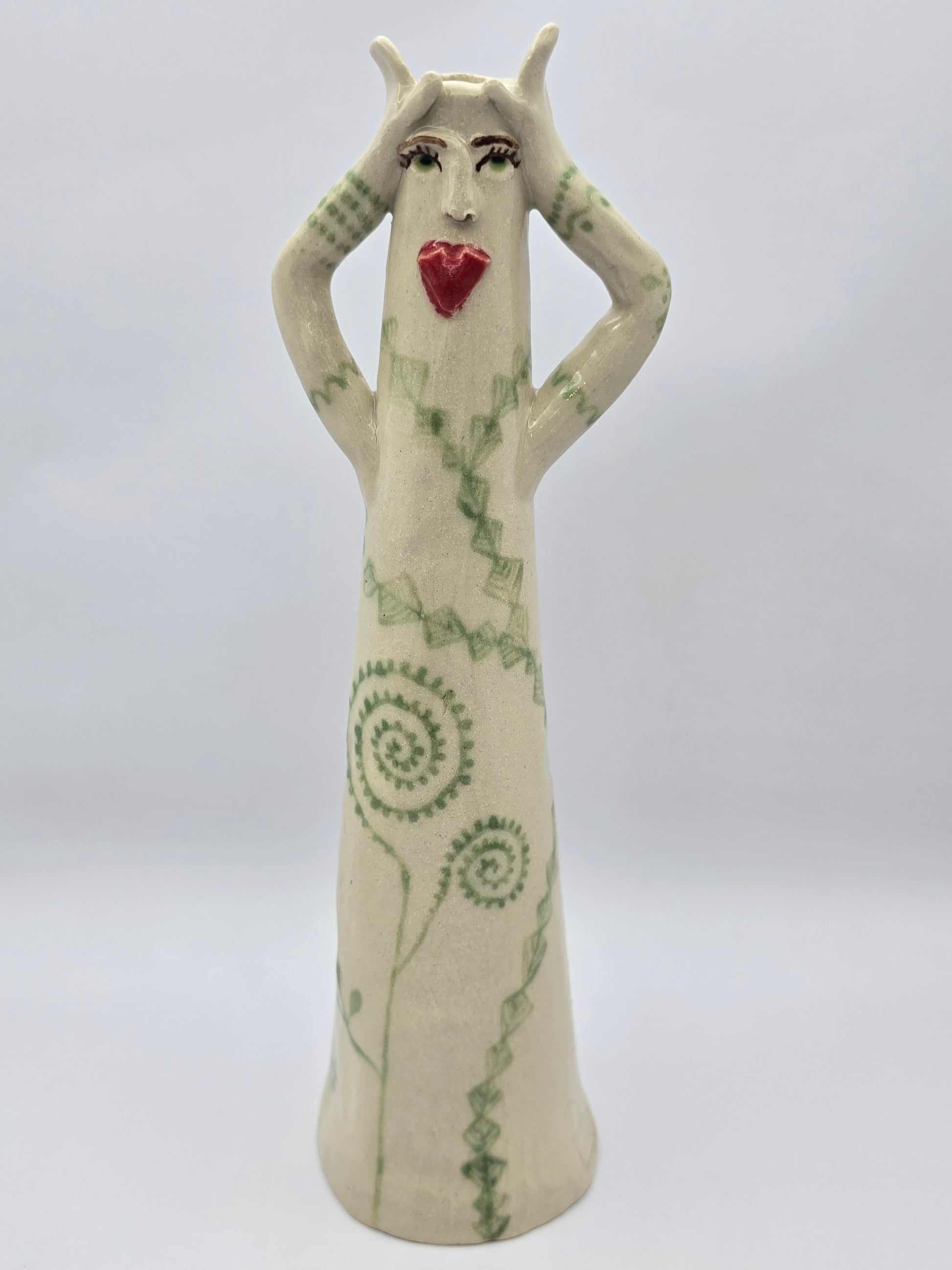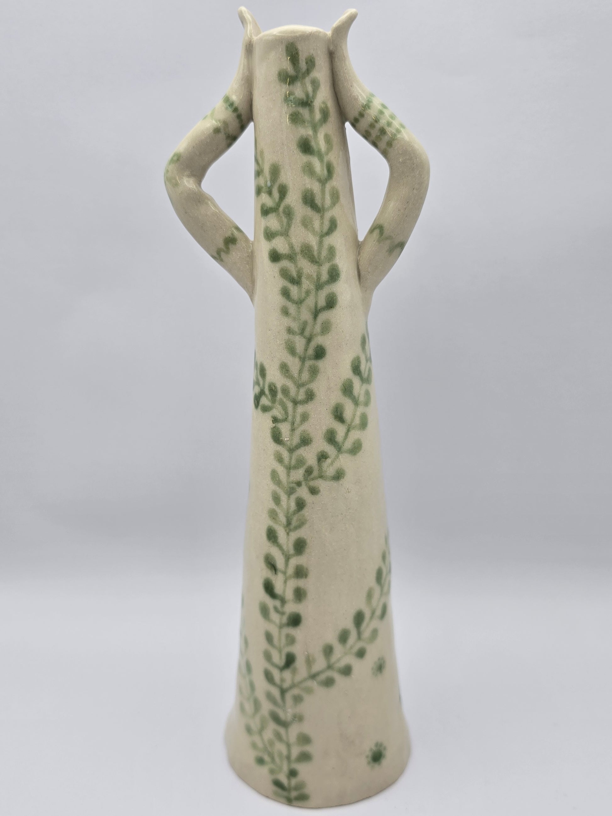 This lovely lady is hand-painted and fully glaced, high-quality stoneware. She holds liquid and can be used as a flower vase, a candle holder, a diffuser or as a decoration in her own right