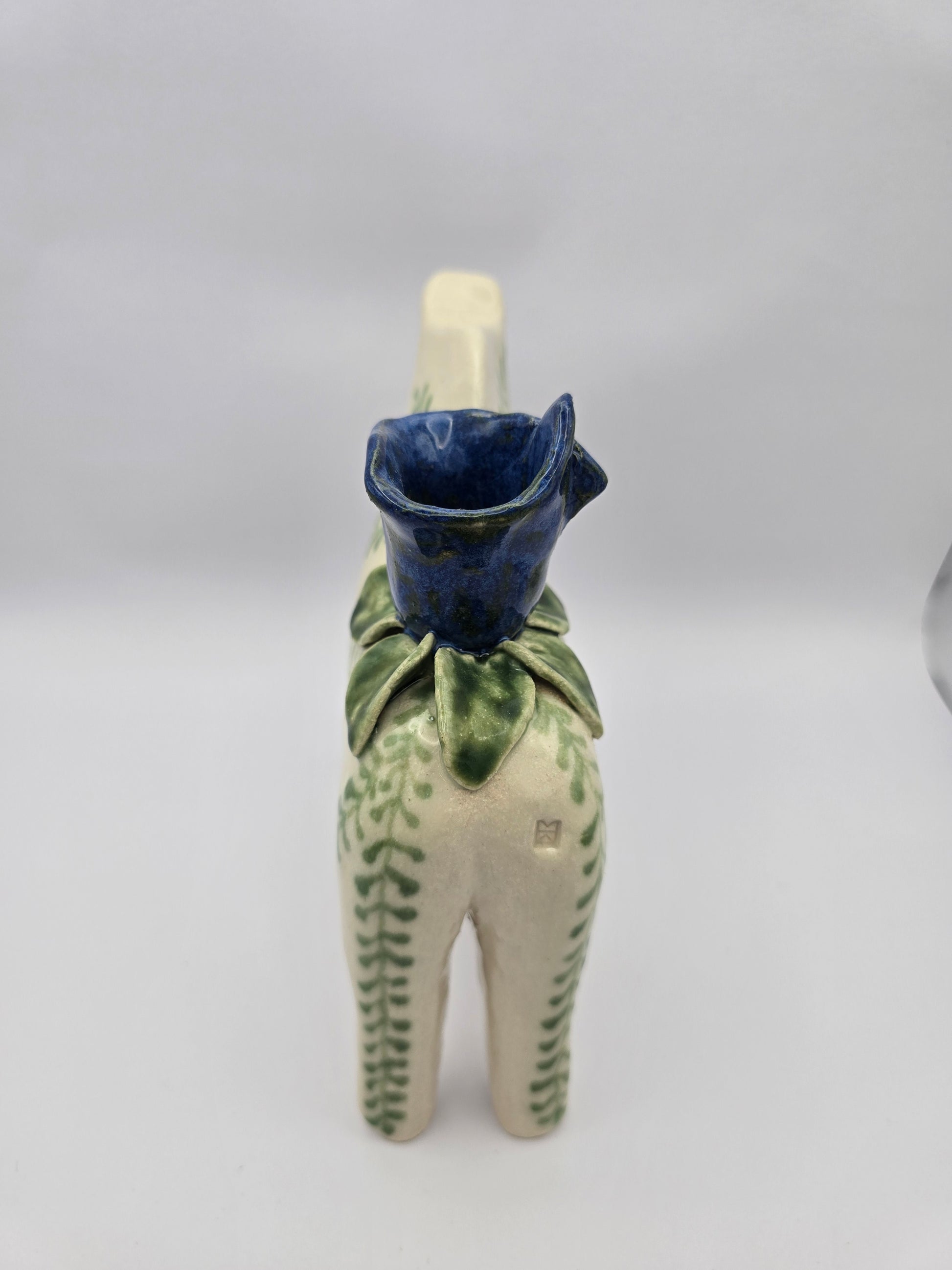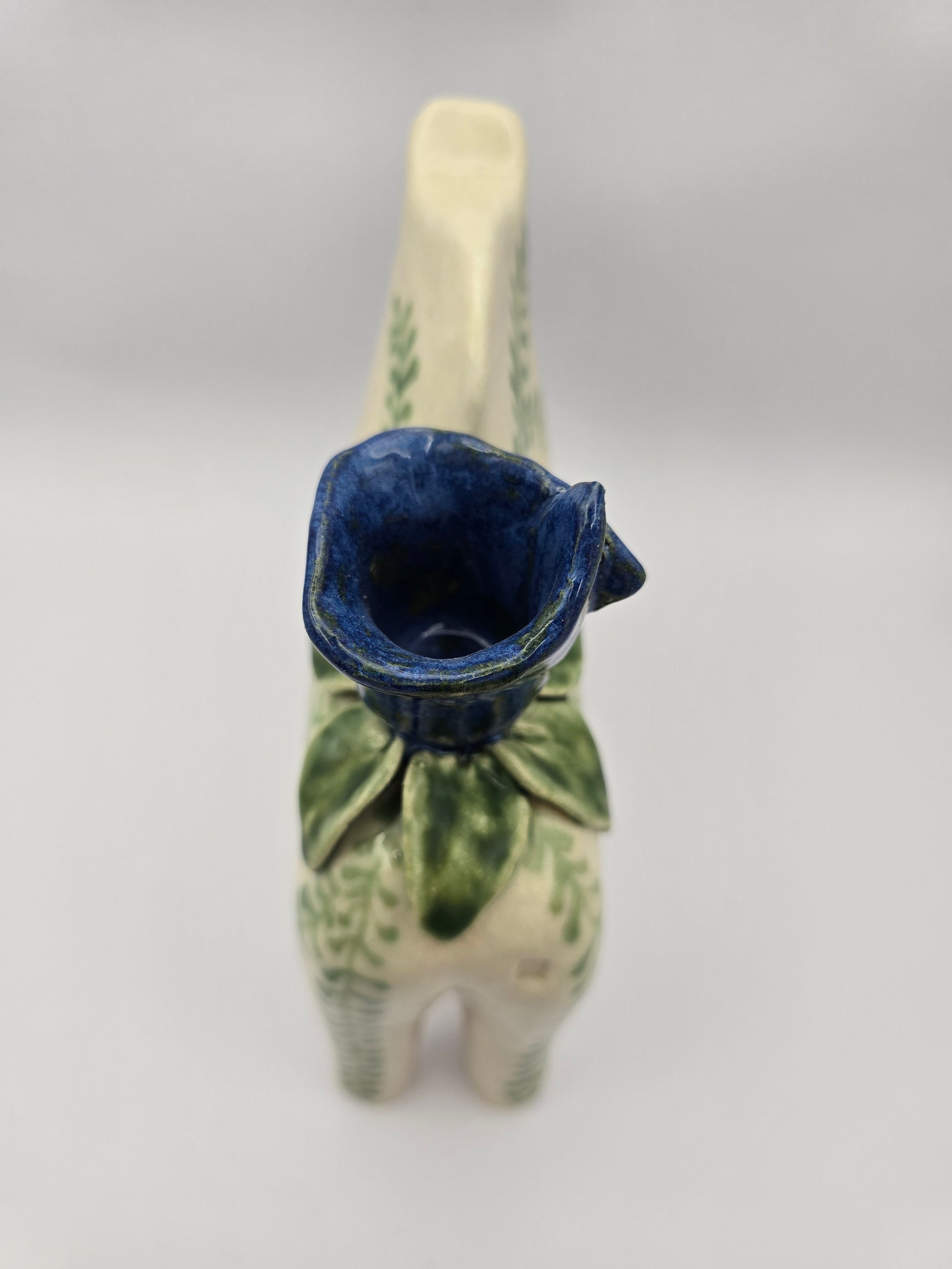 Handbuilt and fully glaced durable stoneware with a flower-shaped candle holder on top.